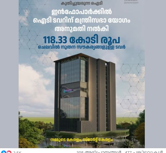 കേരളത്തിന്റെ ഐടി മേഖലയ്ക്ക് പുത്തൻ ഉണർവ് നൽകിക്കൊണ്ട് കൊച്ചി ഇൻഫോപാർക്ക് ഒന്നാം ഘട്ടത്തിൽ പുതിയ ഐടി കെട്ടിടം (ഇൻഫോപാർക്ക് ടവർ) നിർമ്മിക്കുന്നതിന് ഇന്നു ചേർന്ന മന്ത്രിസഭാ യോഗം ഭരണാനുമതി നൽകി. നിരവധി പ്രമുഖ കമ്പനികൾ പ്രവർത്തിക്കുന്ന ഇൻഫോപാർക്ക് കൊച്ചി ക്യാമ്പസിൽ, പുതിയ ഐടി സംരംഭങ്ങളെ ആകർഷിക്കുന്നതിനും നിലവിലെ കമ്പനികളുടെ വികസന ആവശ്യങ്ങൾക്കുമായി ബിൽട്ട് അപ്പ് സ്പേസിന്റെ വലിയ ആവശ്യകതയാണുള്ളത്. ഈ വർദ്ധിച്ചുവരുന്ന ആവശ്യം പരിഗണിച്ചാണ് ഇൻഫോപാർക്ക് ടവർ നിർമ്മിക്കുന്നത്.