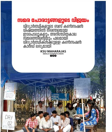 മഹാരാജാസ് കോളേജിന്റെ സ്റ്റേഡിയത്തിലെ കടമുറി വാടകയിൽ നിന്ന് ലഭിക്കാനുള്ള മൂന്നരക്കോടി രൂപ തിരിച്ചു പിടിക്കുക,വിദ്യാർത്ഥികൾക്ക് വർഷങ്ങളായി കിട്ടിയിട്ടില്ലാത്ത പ്രൈവറ്റ് ബസ് കൺസഷൻ ഉടനടി കാർഡുകൾ നൽകുക,കോളേജിന്റെ അടിസ്ഥാന സൗകര്യങ്ങൾ വികസിപ്പിക്കാൻ വേണ്ട നടപടിയെടുക്കുക തുടങ്ങിയ ആവശ്യങ്ങൾ ഉന്നയിച്ച് കെ.എസ്.യു മഹാരാജാസ് കോളേജ് യൂണിറ്റ് കമ്മിറ്റിയുടെ നേതൃത്വത്തിൽ നടക്കുന്ന അനിശ്ചിത കാല സമരം നാലാം ദിവസം പിന്നിട്ടു .