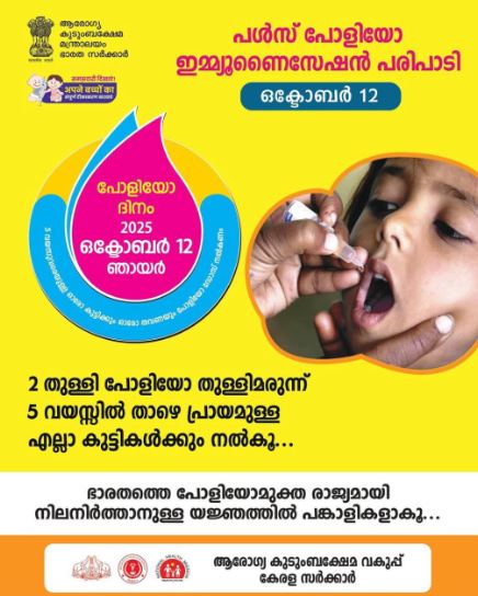 ഒക്ടോബർ 12 ഞായറാഴ്ച പൾസ് പോളിയോ ദിനമായി ആചരിക്കുകയാണ്. ജില്ലയിൽ അഞ്ചു വയസ്സിന് താഴെയുള്ള 1,89,307 കുട്ടികൾക്കാണ് പൾസ് പോളിയോ ദിനത്തിൽ പോളിയോ തുള്ളി മരുന്ന് നൽകുന്നത്.
