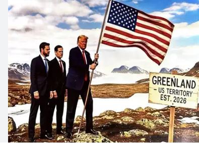 മറ്റൊരു പോസ്റ്റില് ഗ്രീന്ലാന്ഡില് യുഎസ് പതാകയുമേന്തി നില്ക്കുന്ന ചിത്രവും ട്രംപ് പങ്കുവെച്ചിട്ടുണ്ട്. വൈസ് പ്രസിഡന്റ് ജെഡി വാന്സ്, യുഎസ് സ്റ്റേറ്റ് സെക്രട്ടറി മാര്ക്കോ റൂബിയോ എന്നിവരോടൊപ്പമാണ് ട്രംപ് നില്ക്കുന്നത്. ഗ്രീന്ലാന്ഡ് യുഎസ് പ്രദേശമാണെന്നും, സ്ഥാപിക്കപ്പെട്ടത് 2026ല് ആണെന്നും സൂചിപ്പിക്കുന്ന ഒരു ബോര്ഡും അരികിലായി ചിത്രീകരിച്ചിരിക്കുന്നു. ചിത്രത്തില് ട്രംപിനൊപ്പം ജെഡി വാന്സും മാര്ക്കോ റൂബിയോയും ഗ്രീന്ലാന്ഡില് അമേരിക്കന് പതാക നാട്ടുന്നതായി കാണാം.