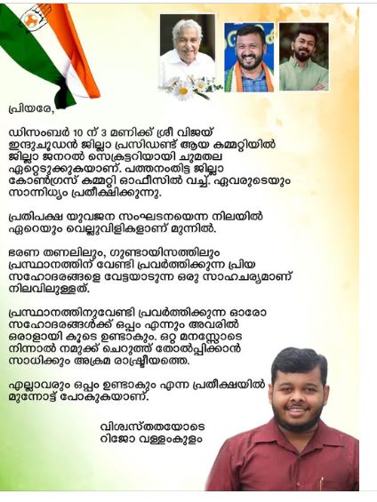 ബലാത്സംഗക്കേസിൽ അറസ്റ്റിലായ പാലക്കാട് എംഎൽഎ രാഹുൽ മാങ്കൂട്ടത്തിലിനുവേണ്ടി ക്ഷേത്രത്തിലും പള്ളിയിലും വഴിപാടുകളും പൂജയും നടത്തി യൂത്ത് കോൺഗ്രസ് നേതാവ്. യൂത്ത് കോൺഗ്രസ് പത്തനംതിട്ട ജില്ലാ ജനറൽ സെക്രട്ടറി റെജോ ജോർജാണ്(റിജോ വള്ളംകുളം ) രാഹുലിനായി പള്ളിയിലും ക്ഷേത്രത്തിലും വഴിപാടുകളും പൂജയും നടത്തിയത്.
