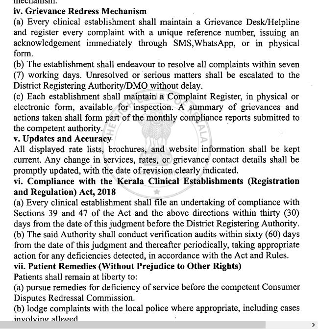 എല്ലാ ക്ലിനിക്കൽ സ്ഥാപനങ്ങളിലും ഒരു പരാതി പരിഹാര ഡസ്ക്/ഹെൽപ്പ് ലൈൻ ഉണ്ടാകേണ്ടതും എല്ലാ പരാതികൾക്കും തനതായ ഒരു റഫറൻസ് നമ്പർ നൽകി രജിസ്റ്റർ ചെയ്യേണ്ടതും പരാതി കക്ഷിക്ക് എസ്.എം.എസ്, വാട്ട്സാപ്പ് അല്ലെങ്കിൽ പേപ്പർ മുഖേന ഒരു കൈപറ്റ് രസീത് നൽകേണ്ടതുമാണ്. ലഭിച്ച പരാതി 7 പ്രവൃത്തി ദിനത്തിനുള്ളിൽ പരിഹരിക്കേണ്ടതും അപ്രകാരം പരിഹരിക്കപ്പെടാത്തതും ഗൗരവതരവുമായ പരാതികൾ ജില്ലാ രജിസ്റ്ററിംഗ് അതോറിറ്റിക്ക്/ ജില്ലാ മെഡിക്കൽ ഓഫീസർക്ക് കൈമാറേണ്ടതുമാണ്. എല്ലാ ക്ലിനിക്കൽ സ്ഥാപനങ്ങളിലും ഒരു പരാതി രജിസ്റ്റർ ബുക്ക് രൂപത്തിലോ ഇലക്ട്രോണിക് രൂപത്തിലോ സൂക്ഷിക്കേണ്ടതും പരിശോധനയ്ക്ക് വിധേയപ്പെടുത്തേണ്ടതുമാണ്. ലഭിച്ച പരാതികളുടേയും അതിൻമേൽ എടുത്ത നടപടികളുടെയും സംക്ഷിപ്തം കോമ്പീറ്റൻറ് അതോറിറ്റിക്ക് സമർപ്പിക്കുന്ന പ്രതിമാസ റിപ്പോർട്ടിന്റെ ഭാഗമാക്കേണ്ടതാണ്.