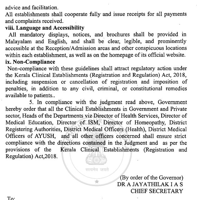 നൽകുന്ന സേവനങ്ങൾക്കും, ചികിത്സയ്ക്കും ബാധകമായ ഫീസ് നിരക്കുകളും പാക്കേജുകളും, പരാതി പരിഹാര ആഫീസറുടെ ഇ-മെയിൽ വിലാസം, പേര്, ഫോൺനമ്പർ, ജില്ലാ മെഡിക്കൽ ഓഫീസർ, ജില്ലാ രജിസ്റ്ററിംഗ് അതോറിറ്റി എന്നിവരെ ബന്ധപ്പെടുവാനുള്ള സംവിധാനം, ഫോൺനമ്പറുകൾ തുടങ്ങി രോഗികളുടെ അവകാശങ്ങളും ലഭ്യമായ സൗകര്യങ്ങളുടെ വിവരങ്ങളും മലയാളത്തിലും ഇംഗ്ലീഷിലും അഡ്മിഷൻ ഡസ്കിൽ/റിസപ്ഷൻ സ്ഥലത്ത് പ്രദർശിപ്പിക്കുകയും സ്ഥാപനത്തിന്റെ ഔദ്യോഗിക വെബ്സൈറ്റിൽ പ്രസിദ്ധീകരിക്കേണ്ടതുമാണെന്ന് ആരോഗ്യവകുപ്പ് അഡിഷണൽ ചീഫ് സെക്രട്ടറി ഡോ രാജൻ ഖോബ്രഗഡെ അറിയിച്ചു.