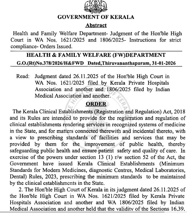 കേരളത്തിൽ ക്ലിനിക്കൽ എസ്റ്റാബ്ലിഷ്മെൻ്റ് ആക്ട് 30.01.2026 മുതൽ നിലവിൽ വന്നു. ഇത് പ്രകാരം എല്ലാ സ്വകാര്യ ആശുപത്രികളിലും ചികിത്സ ചെലവുകൾ പ്രസിദ്ധീകരിക്കണം. ഈ നിയമ പ്രകാരം ചെലവ് കുറഞ്ഞ ചികിത്സ എല്ലാ സ്വകാര്യ ആശുപത്രികളിലും ഇനി മുതൽ ലഭിക്കും എന്നതാണ് ഇതിൻ്റെ പ്രത്യേകത.